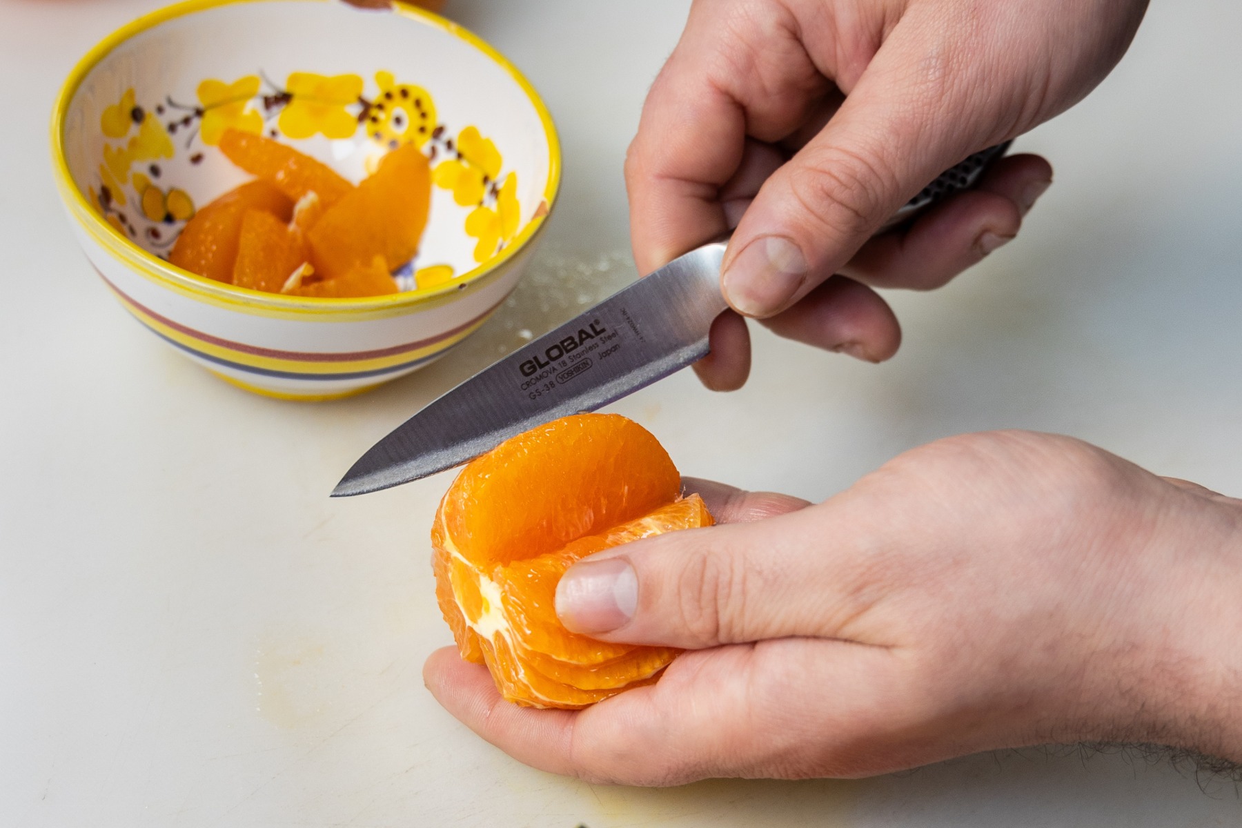 Use smooth, shallow strokes to remove citrus peel or apple skin while preserving as much fruit as possible. The GS-38’s sharp edge glides without tearing.